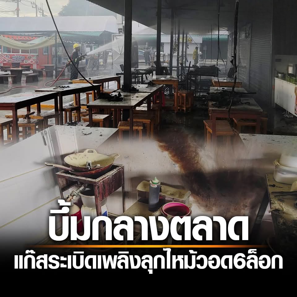 แก๊สระเบิดกลางตลาดดังสมุทรปราการ เพลิงลุกไหม้วอด 6 ล็อก พนักงานจ็บ 1 จนท.เร่งหาสาเหตุ .
