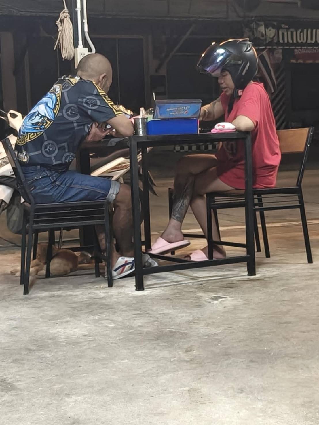 ป้าเจ้าของร้านอาหารเผย สองหนุ่มสาวเข้ามาสั่งอาหารกินกัน ฝ่ายชายทรงสกินเฮด ส่วนฝ่ายหญิงใส่หมวกกันน็อกกินข้าว มีรอยสักที่ขา ถามใส่หมวกกันน็อกทำไม แต่ทั้งสองคนก็ไม่ตอบ นั่งกินกันจนอิ่ม แต่นั่งแช่จนร้านจะปิด ขอเก็บเงินก่อน 320 บาท แถมลดให้เหลือ 300 บาท แต่สองหนุ่มสาวอ้างรอเพื่อนอีกคน พอทวงถามอีกครั้ง กลับบอกไม่มีเงินจ่าย แต่ควักเงินให้มา 100 บาท ก่อนจะขอไปกดเงินมาให้ หลังจากนั้นก็ไม่กลับมาอีกเลย